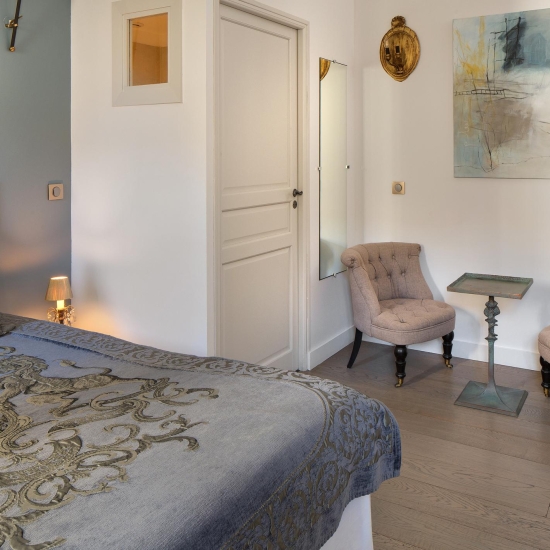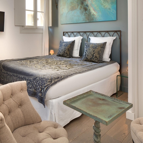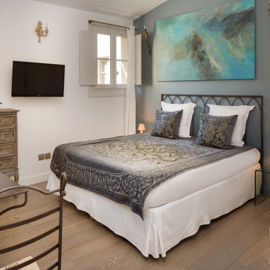 La chambre LUTHER combine confort et élégance dans un espace lumineux. Avec sa vue sur le clocher des Augustins et le jardin méditerranéen, elle invite à la détente. Son lit King size, son coin salon et sa kitchenette moderne font de cette chambre un espace parfait pour un séjour reposant et fonctionnel.
